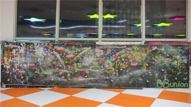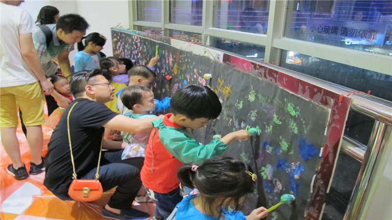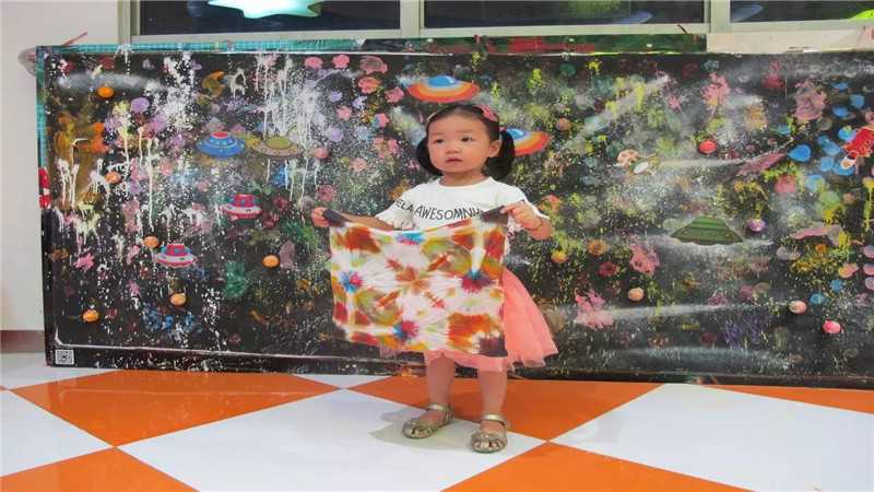 扎染完成后,需要等待10分钟才能打开,在这段时候,小盆友把背景制作成一幅大型的星空油画。